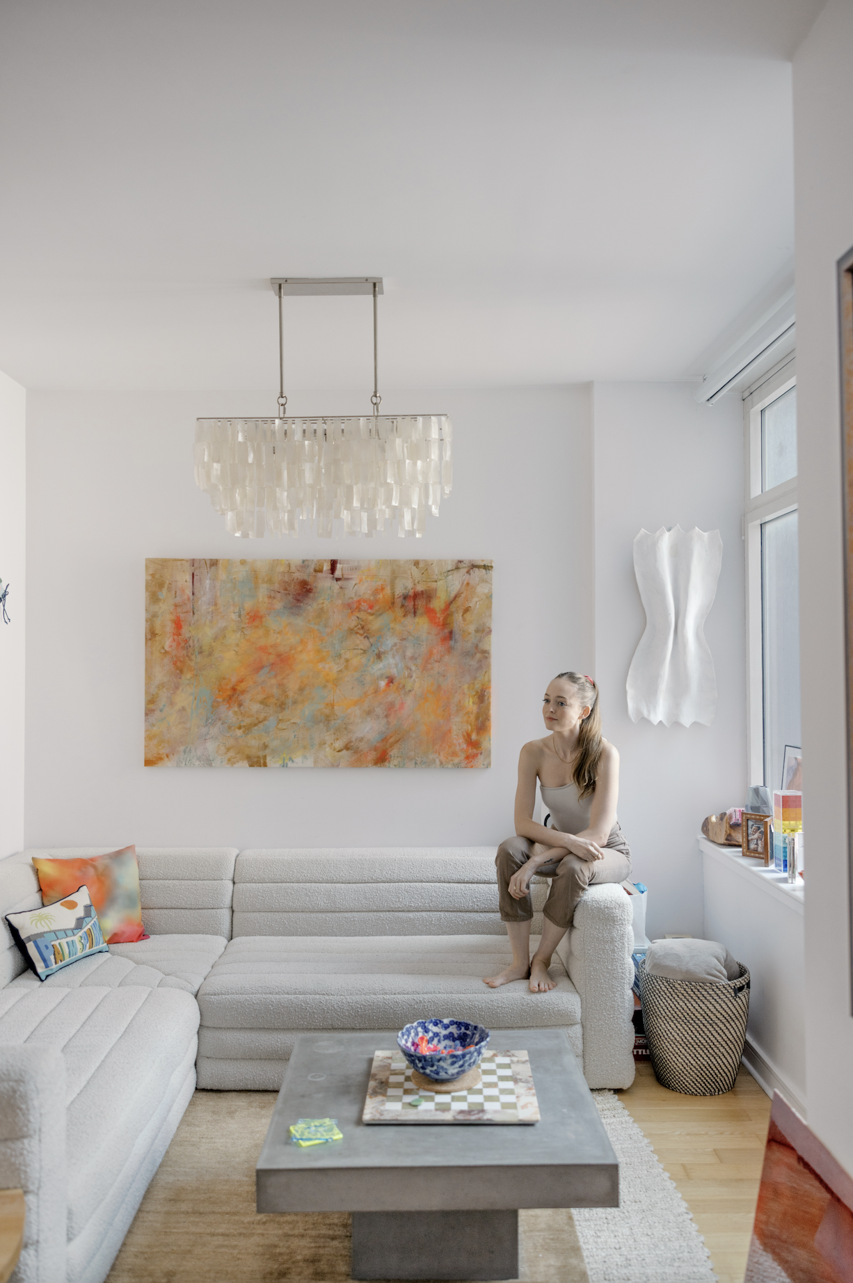 “I like color”. she beams. An almost comically obvious exclamation— surrounded by her tastefully loud pieces of art. A quick scan of the room reveals: an oversized sculpture of farfalle pasta, laser-cut neon acrylic coasters, and vibrant abstract paintings. I settle into her couch, surrounded by the bits of her life she’s thoughtfully collected, created, and scattered: a living embodiment of controlled chaos, rendered in a way that feels homey, elevated, and effortless.